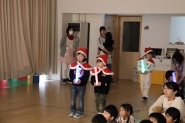 旭川おおぞら認定こども園 クリスマス会 2025年12月24日(水) 今日は、クリスマス会がありました!初めにばら組さんによる、ハンドベル『きのしこの夜』の演奏に合わせてキャンドルサービスが行われました!キラキラした光や演奏に「きれい」、「たのしい」と喜んでいました!サンタさんにプレゼントをもらえてニコニコな子どもたちでした♪ もどる